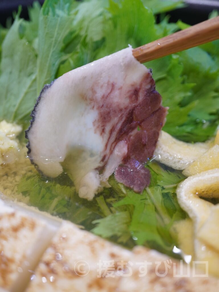 湯気の中で踊る鯨肉をサッとくぐらせれば、部位ごとに異なる旨味と食感が際立ちます。