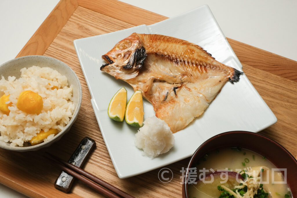 秋の食卓を彩るのは── 萩の海で釣り上げられた あまだいの開き と、山口県萩市の畑で育った さつまいも、そして実りの象徴 栗ご飯🌰